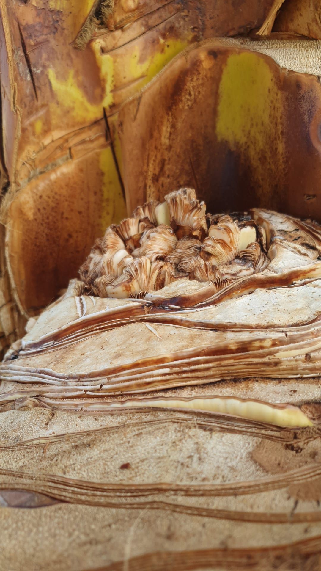 En esta fotografía se aprecia como nacen nuevas hojas del meristemo de la palmera, tan solo semanas despues de haberle realizado un saneamiento.