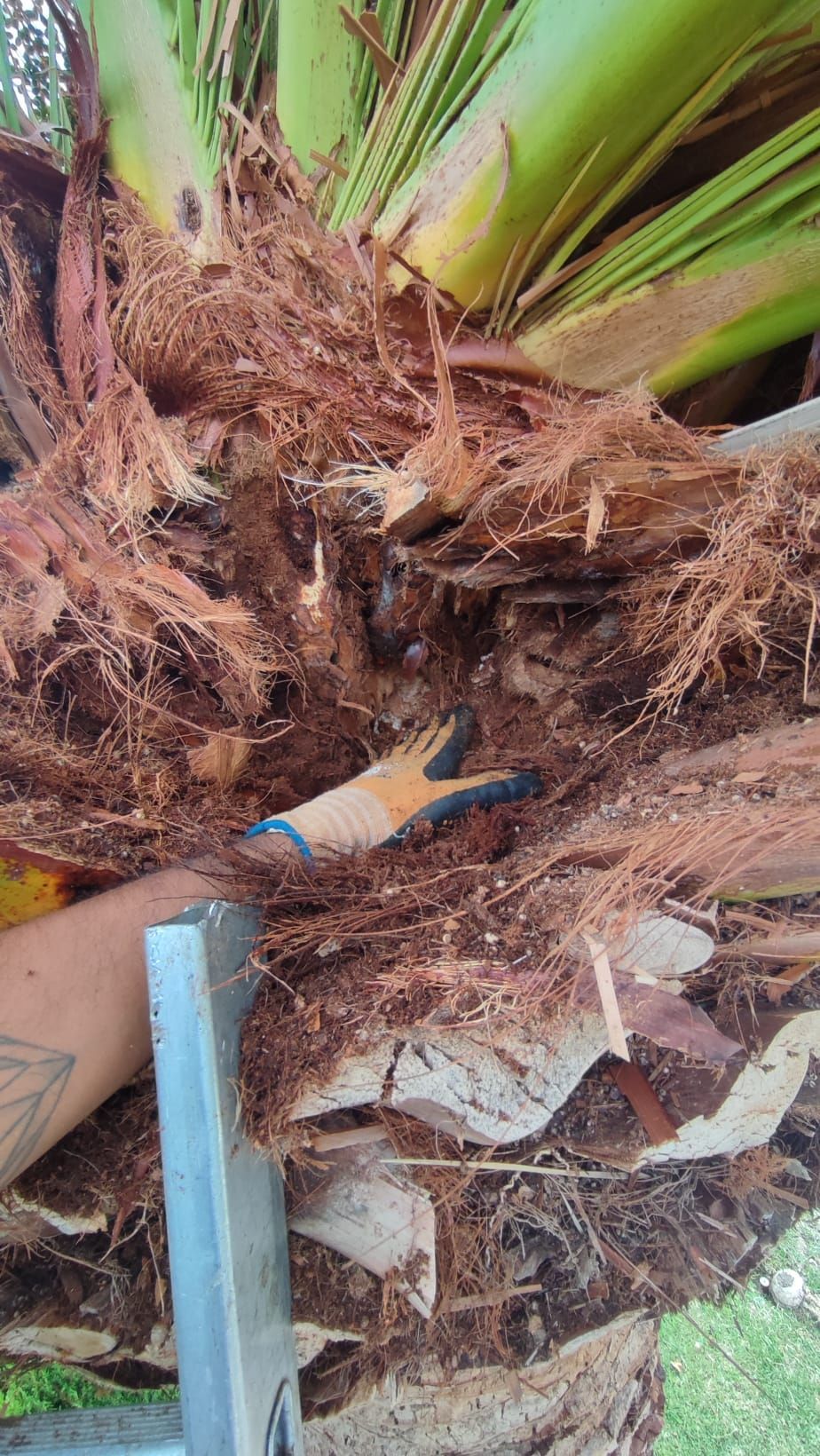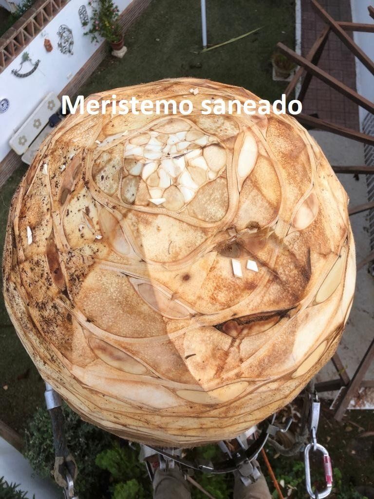 2. Eliminación de los tejidos afectados por picudo rojo. Este proceso consiste en eliminar todos los tejidos y formas vivas del picudo rojo en la palmera mediante el uso de herramientas especializadas para ello.